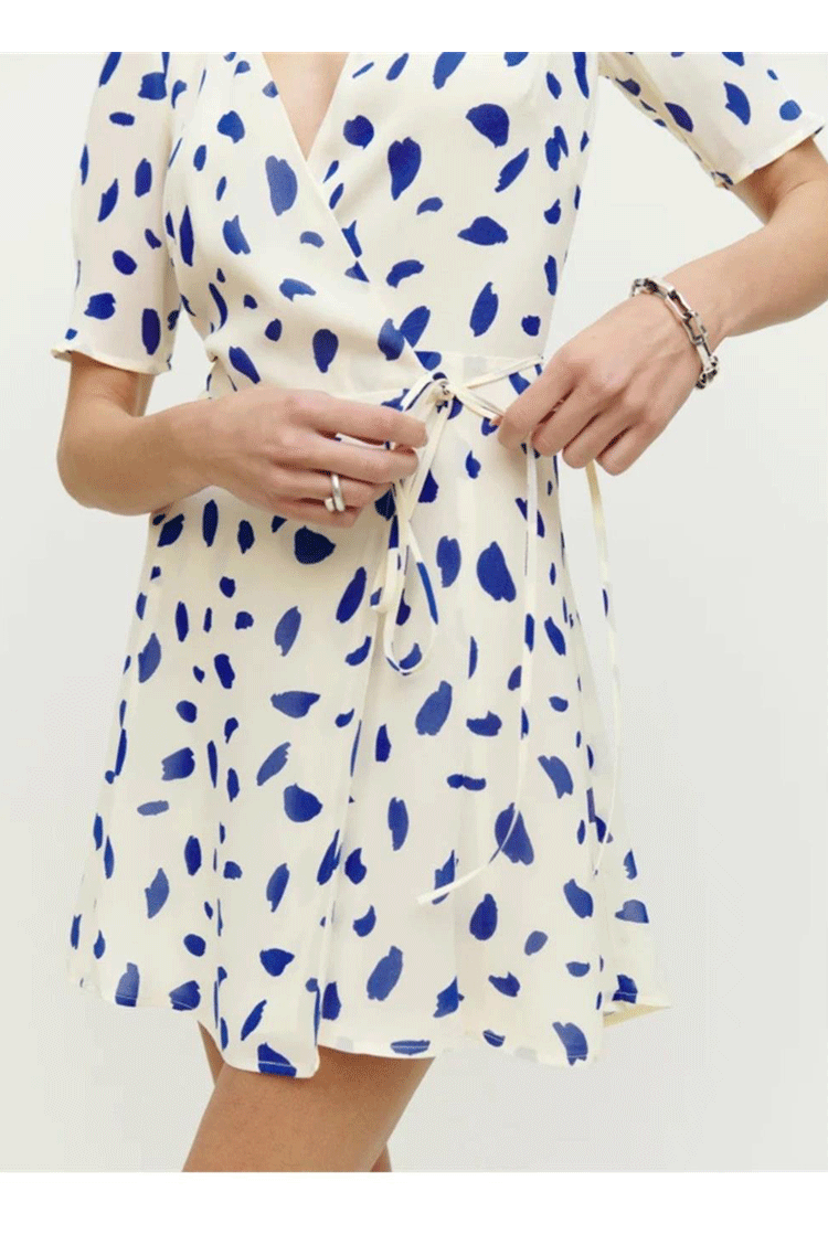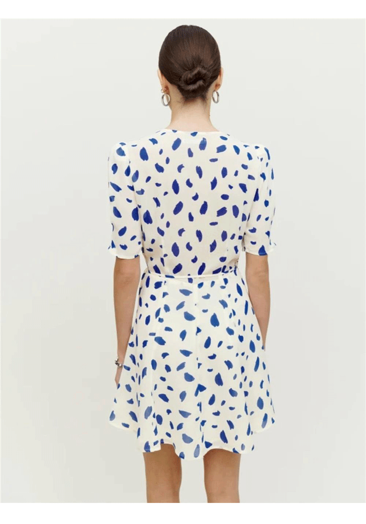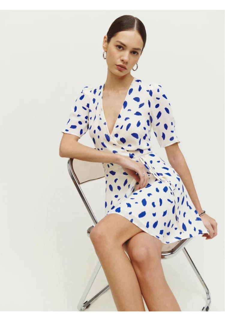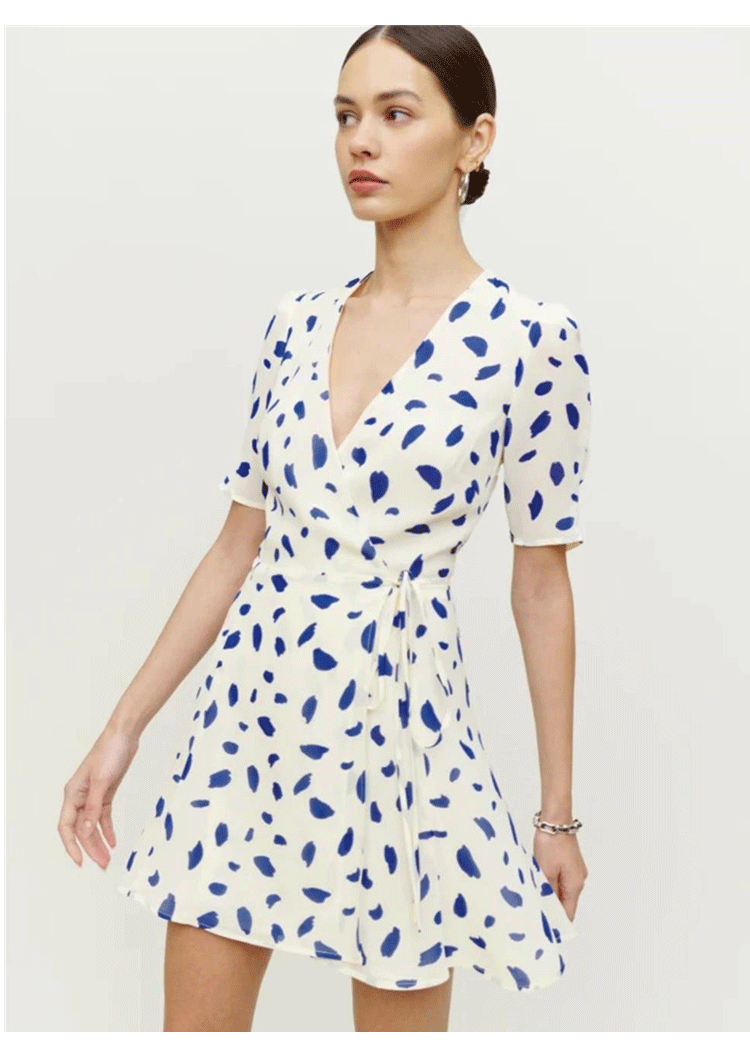 Reformation dress French style white with blue stripes V-neck lace-up one-piece